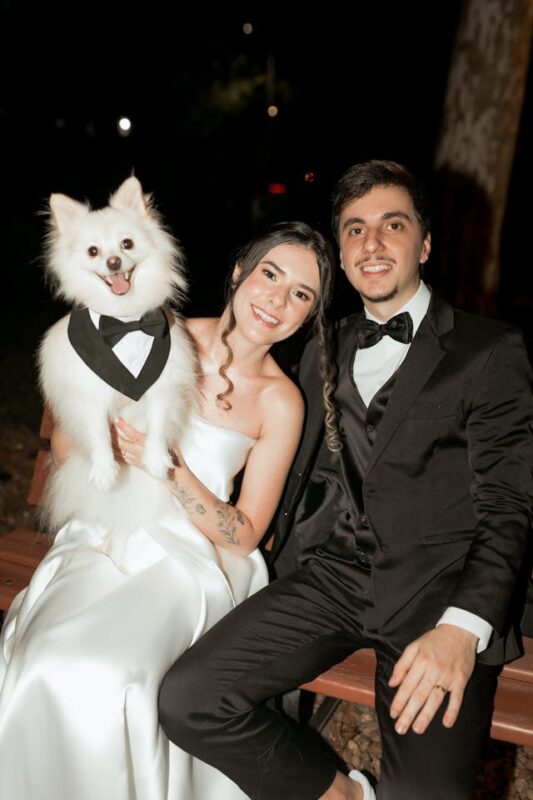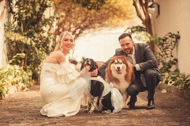 For energetic pets, choose a time when they have already had a chance to walk or play. For more relaxed animals, consider a quiet moment before guests arrive to reduce overstimulation. The results often become some of the couple’s favorite photos because pets bring unfiltered joy to the images.